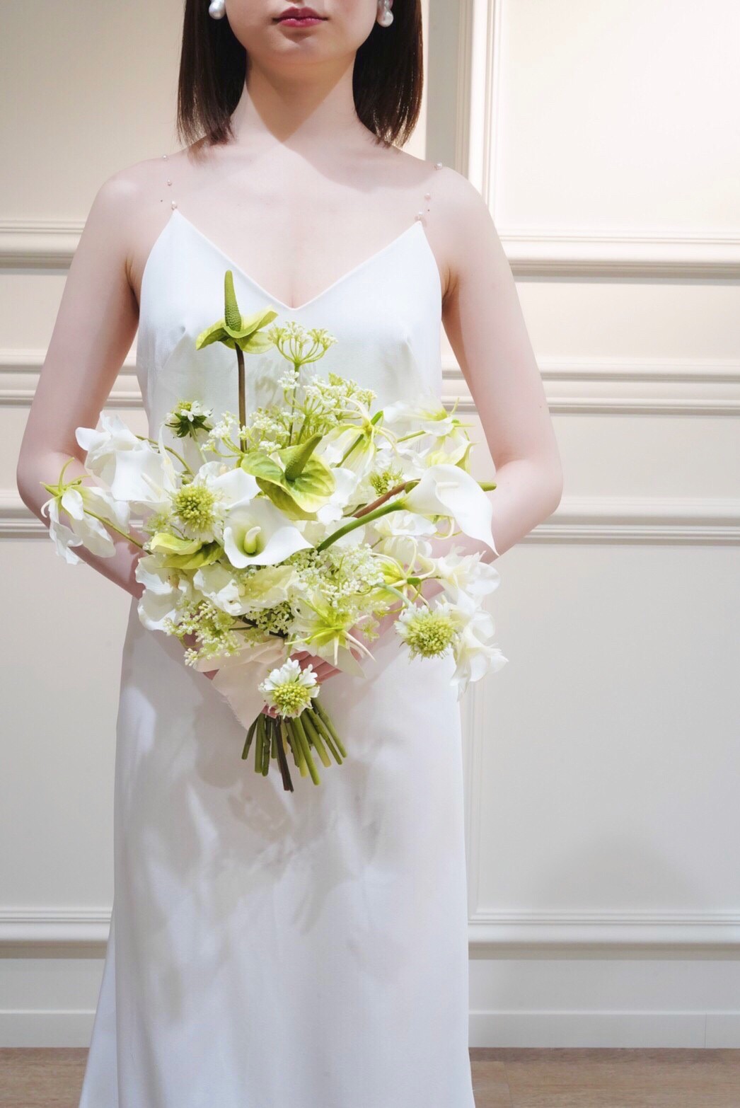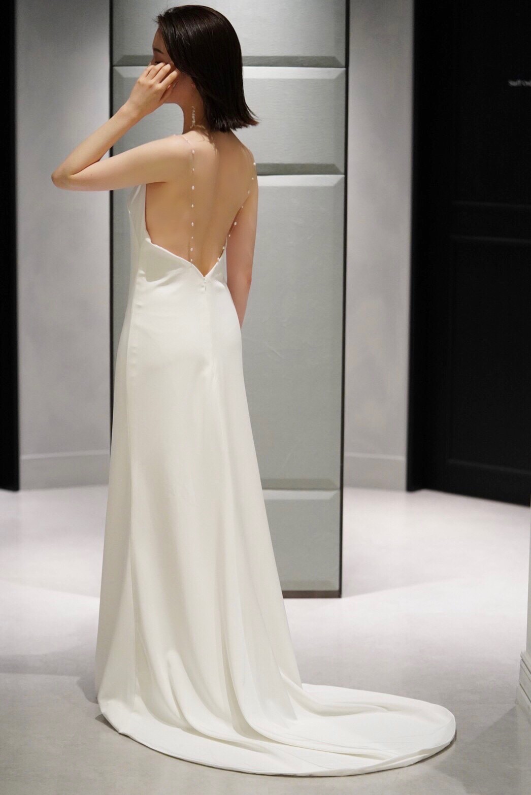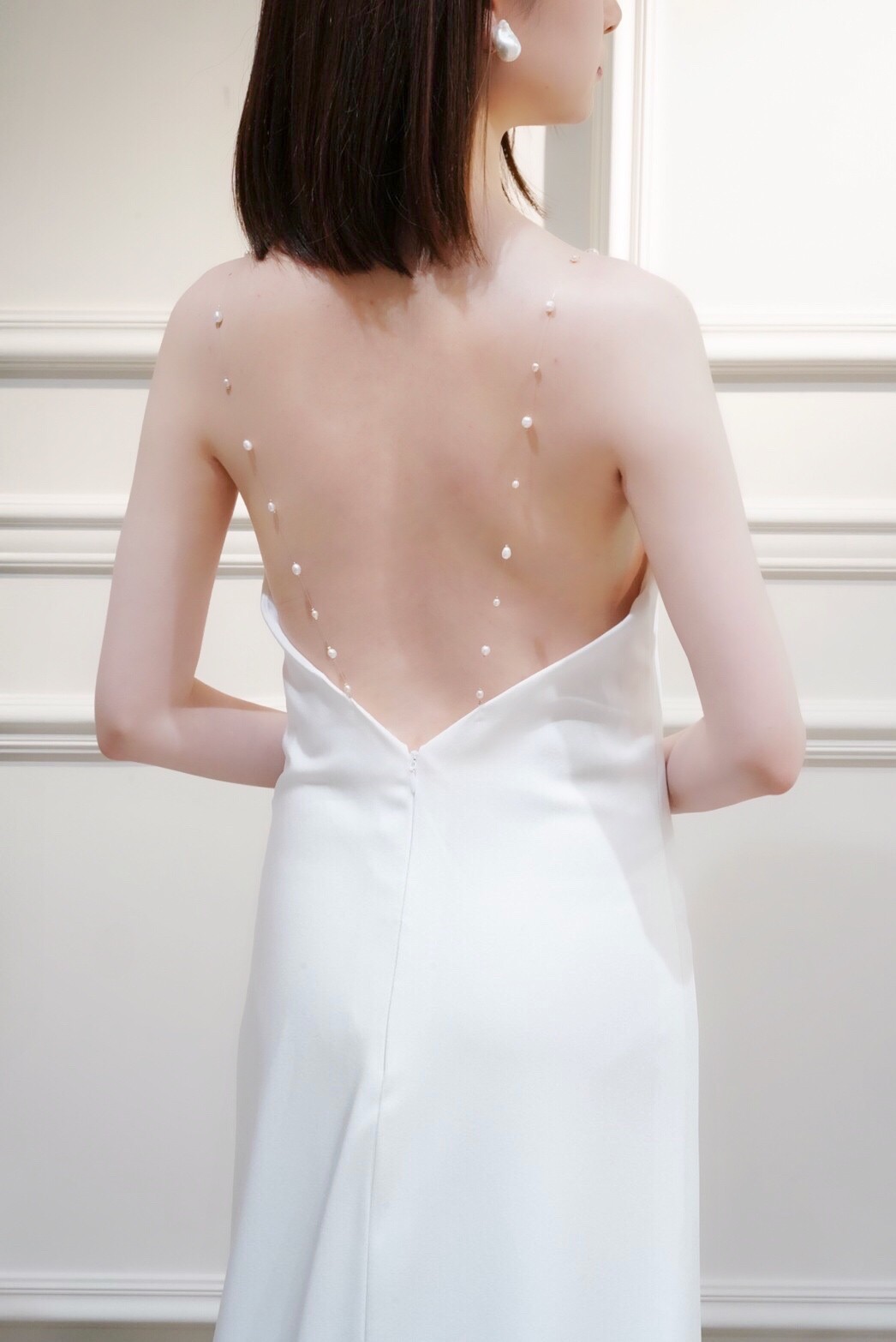 ストラップ部分にパールをあしらった特別感のある1着。バックスタイルがポイントのドレス。