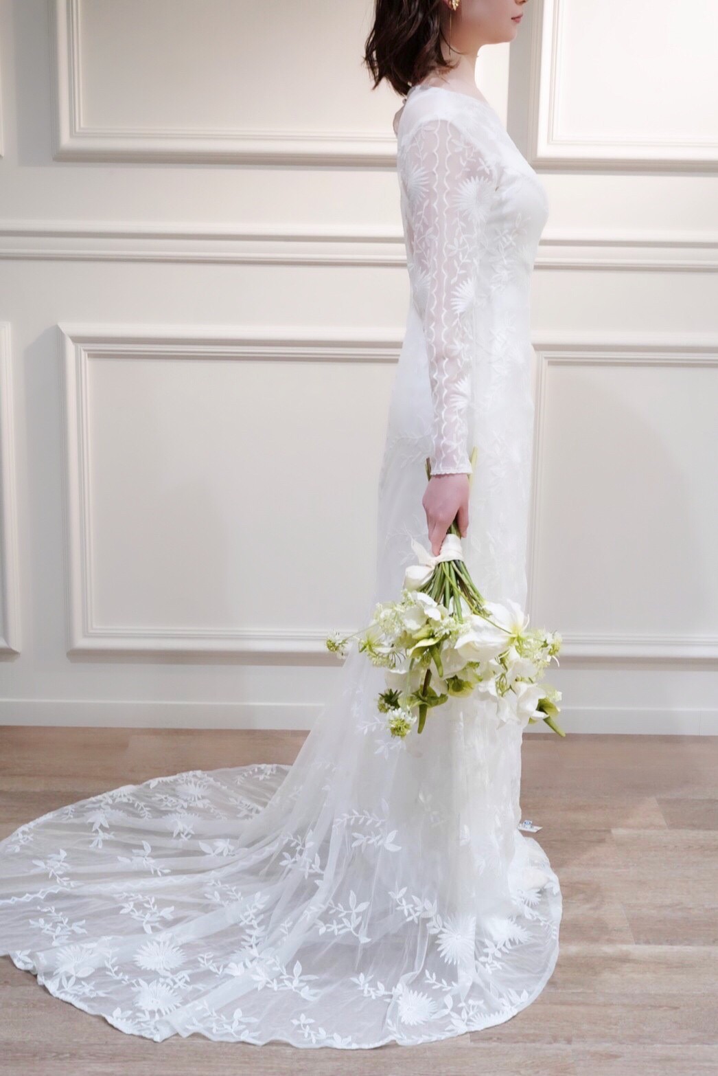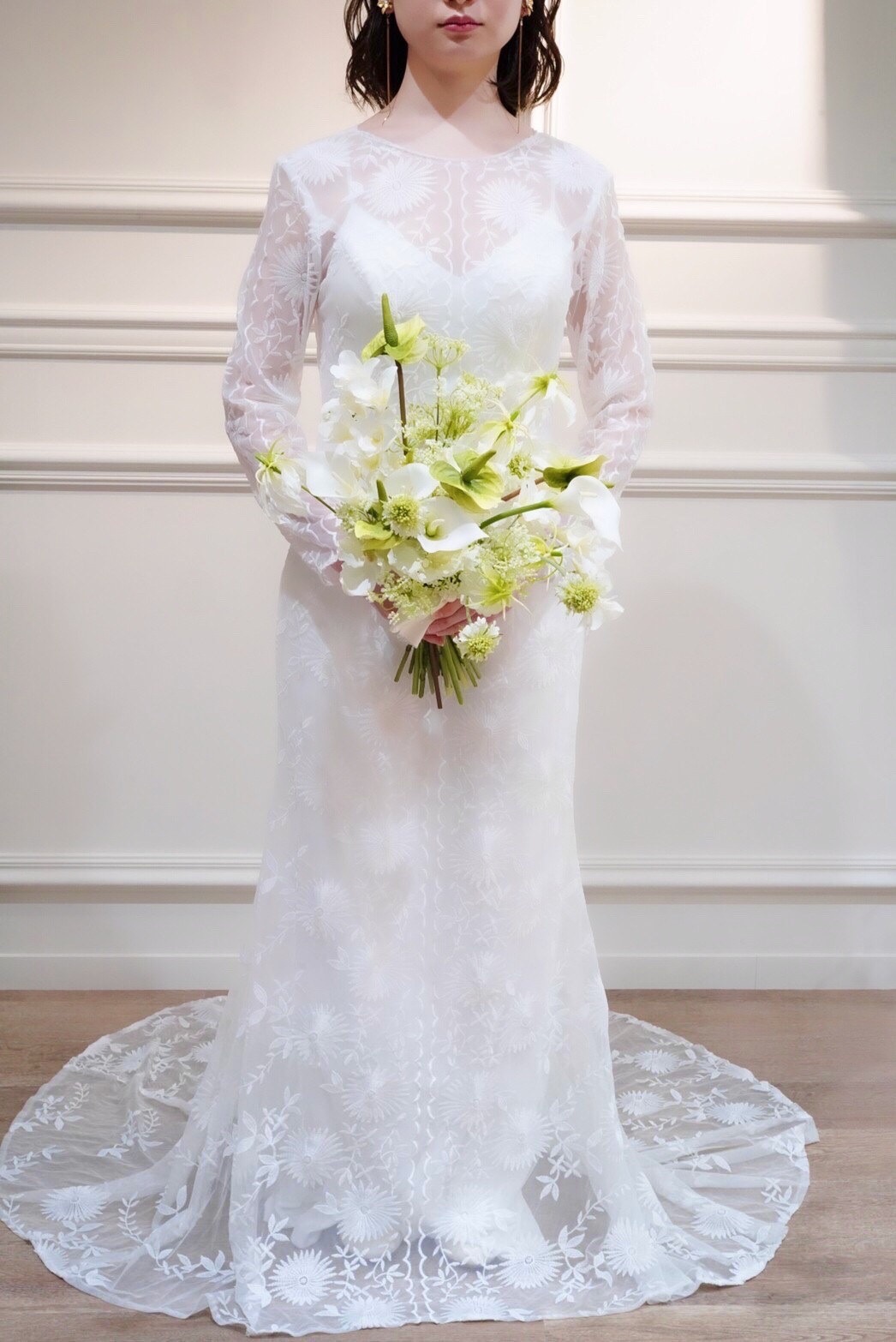 ボタニカルな柄のロングスリーブドレス。洗練された特別感ある1着。