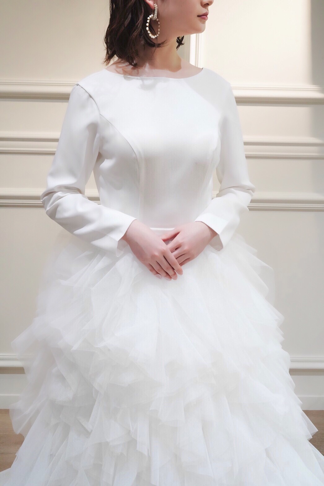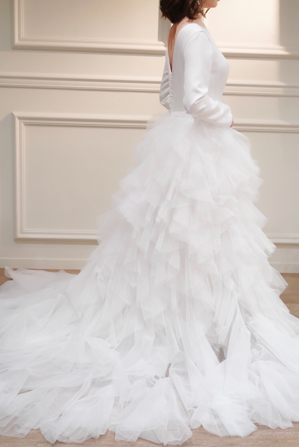ボディラインにフィットするシンプルなトップスに、大胆なカッティングのオーガンジーを何枚も重ね合わせたボリューミーなスカートが印象的な1着。