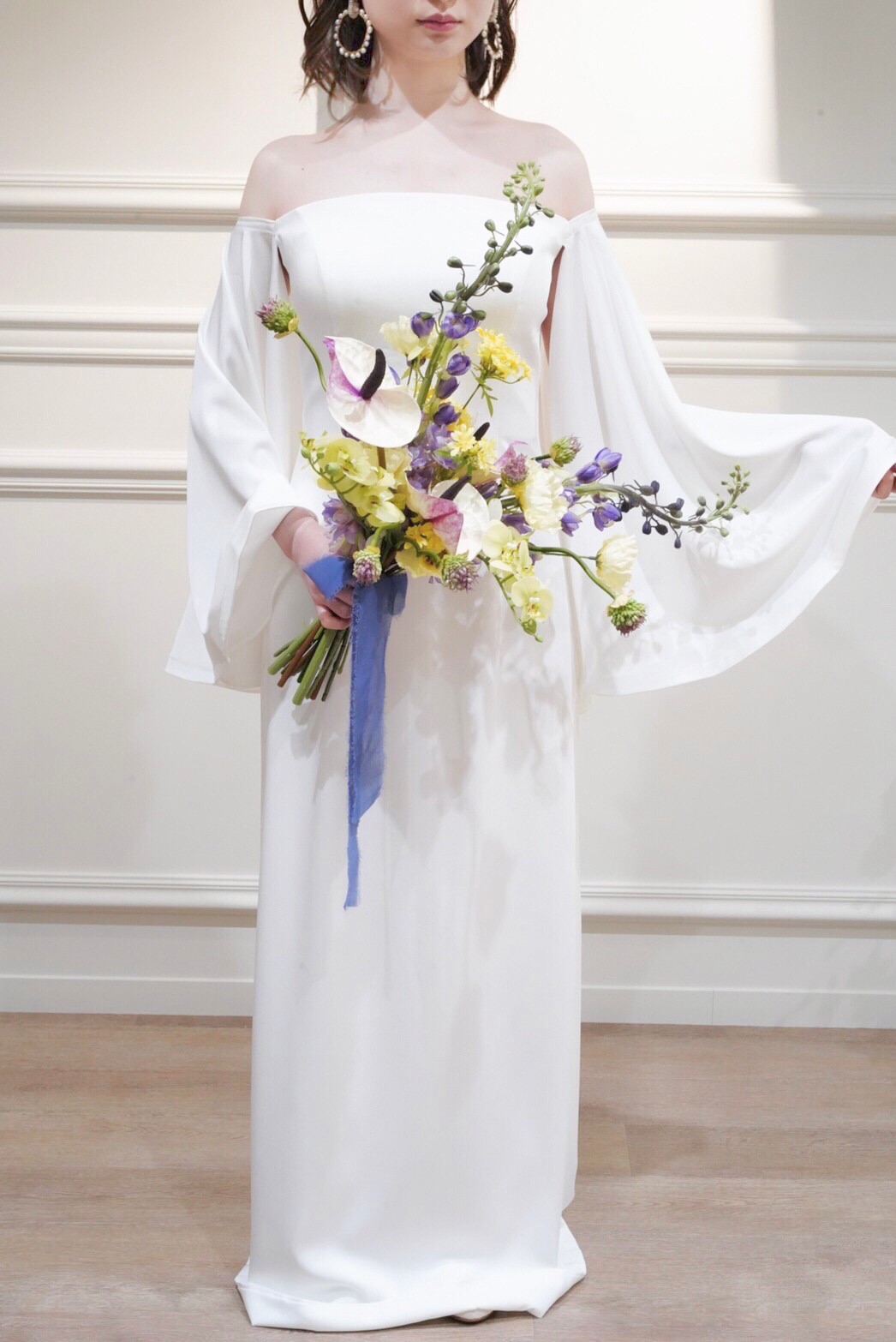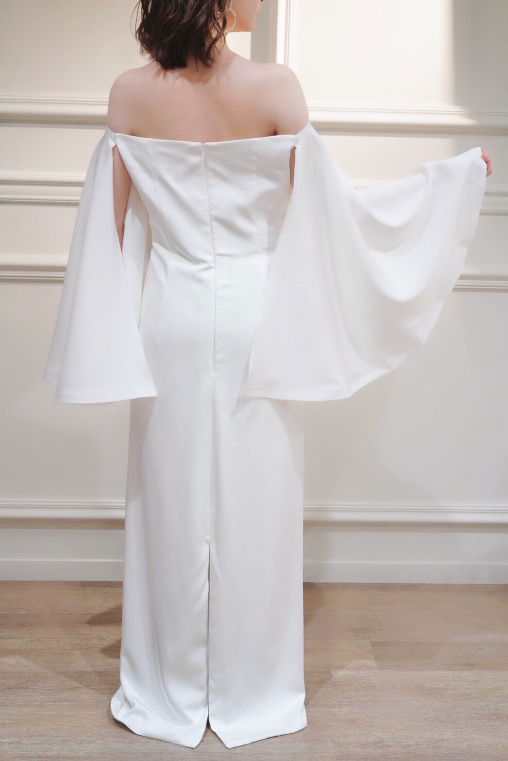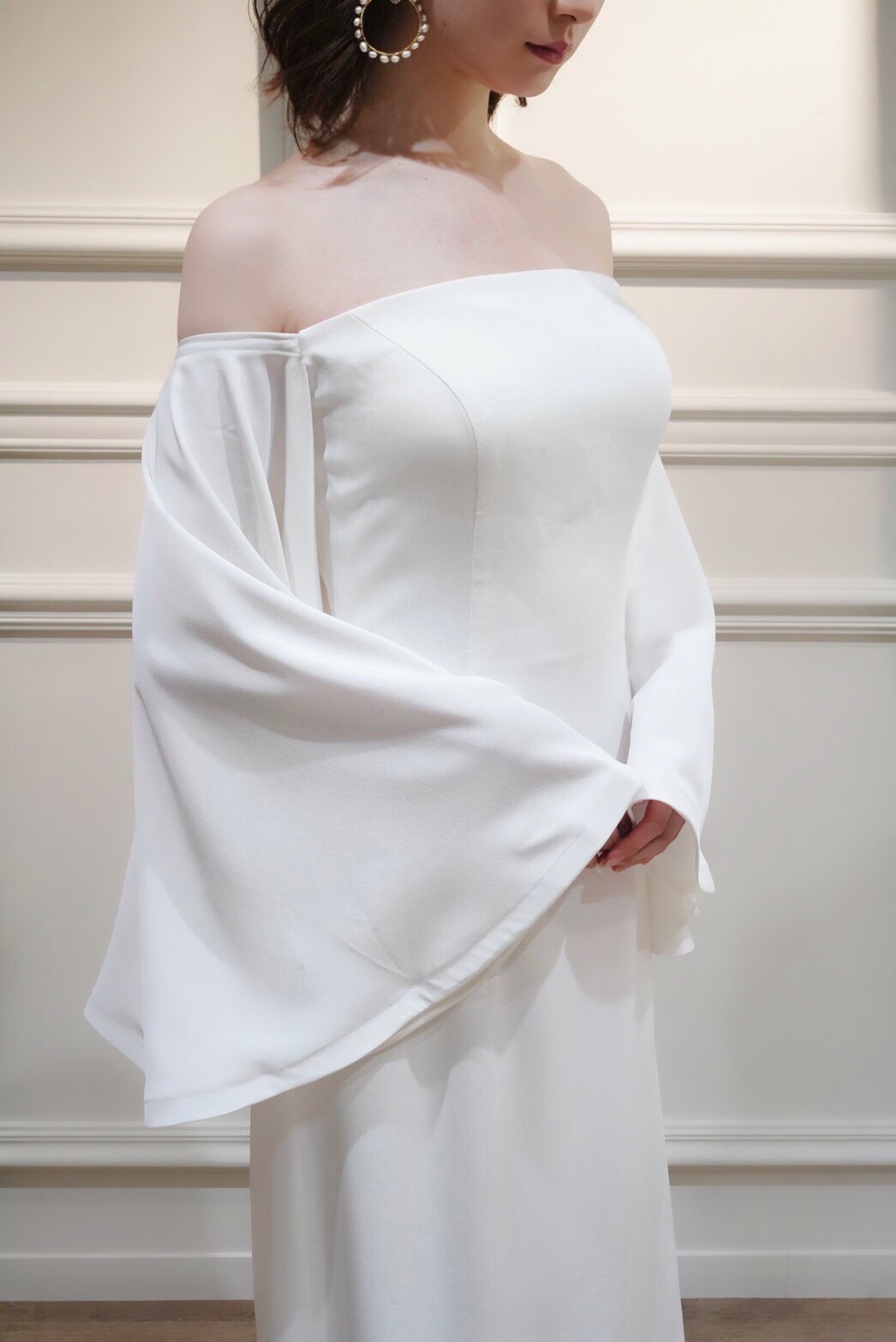 オフショルのスレンダードレス。デザイン性の高い袖のドレープが美しく魅せてくれる1着。