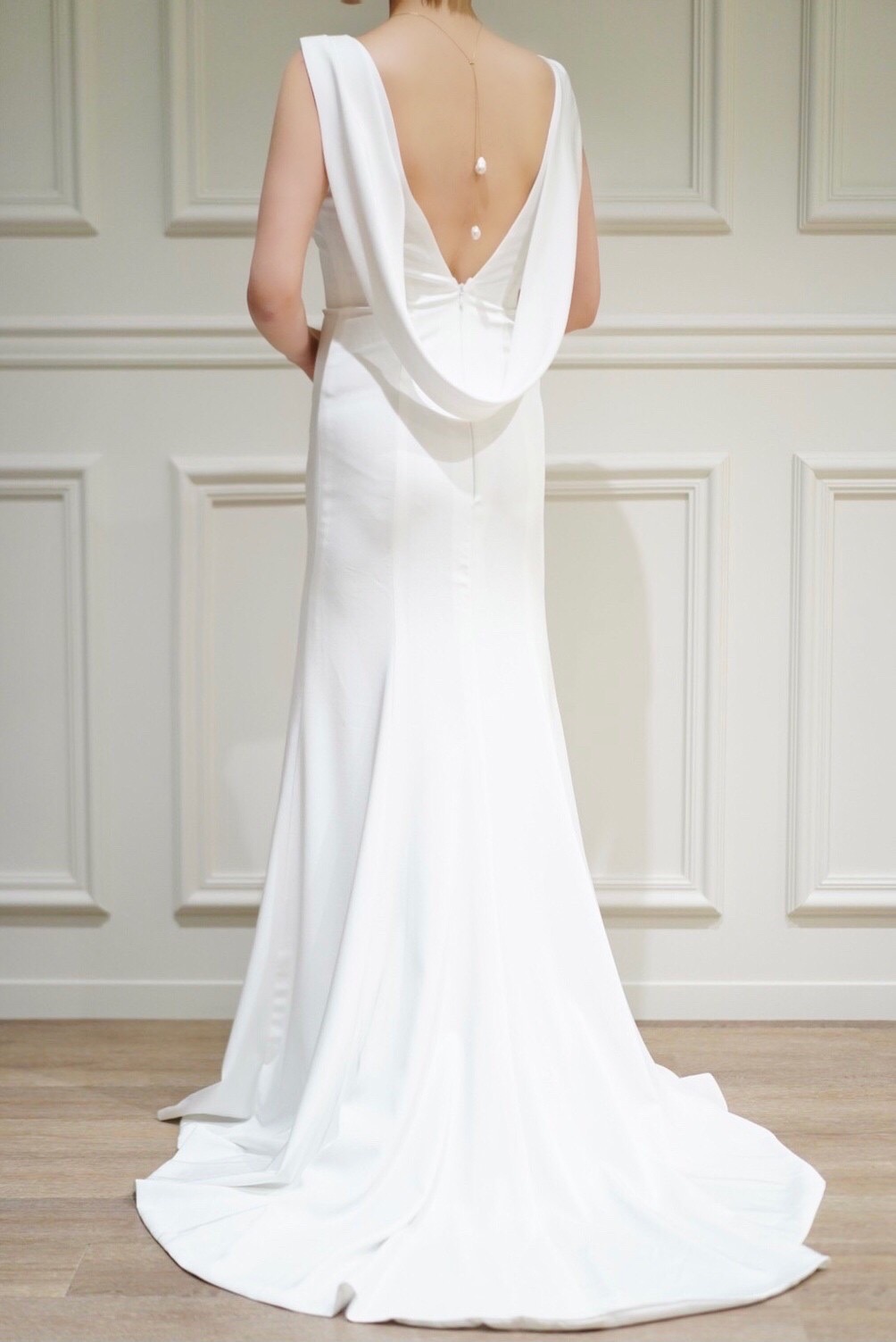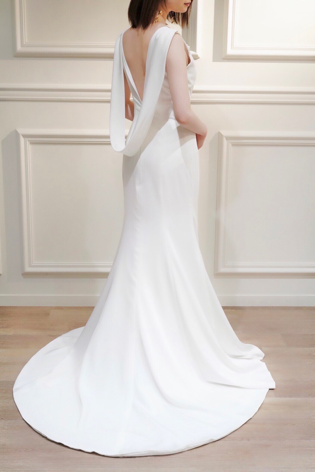 ざっくりと開いたバックスタイルが印象的なノースリーブドレス。 しなやかなマーメイドラインは、女性らしさを際立たせてくれます。
