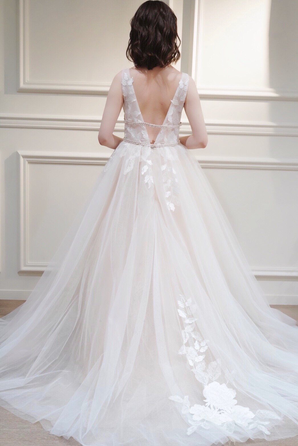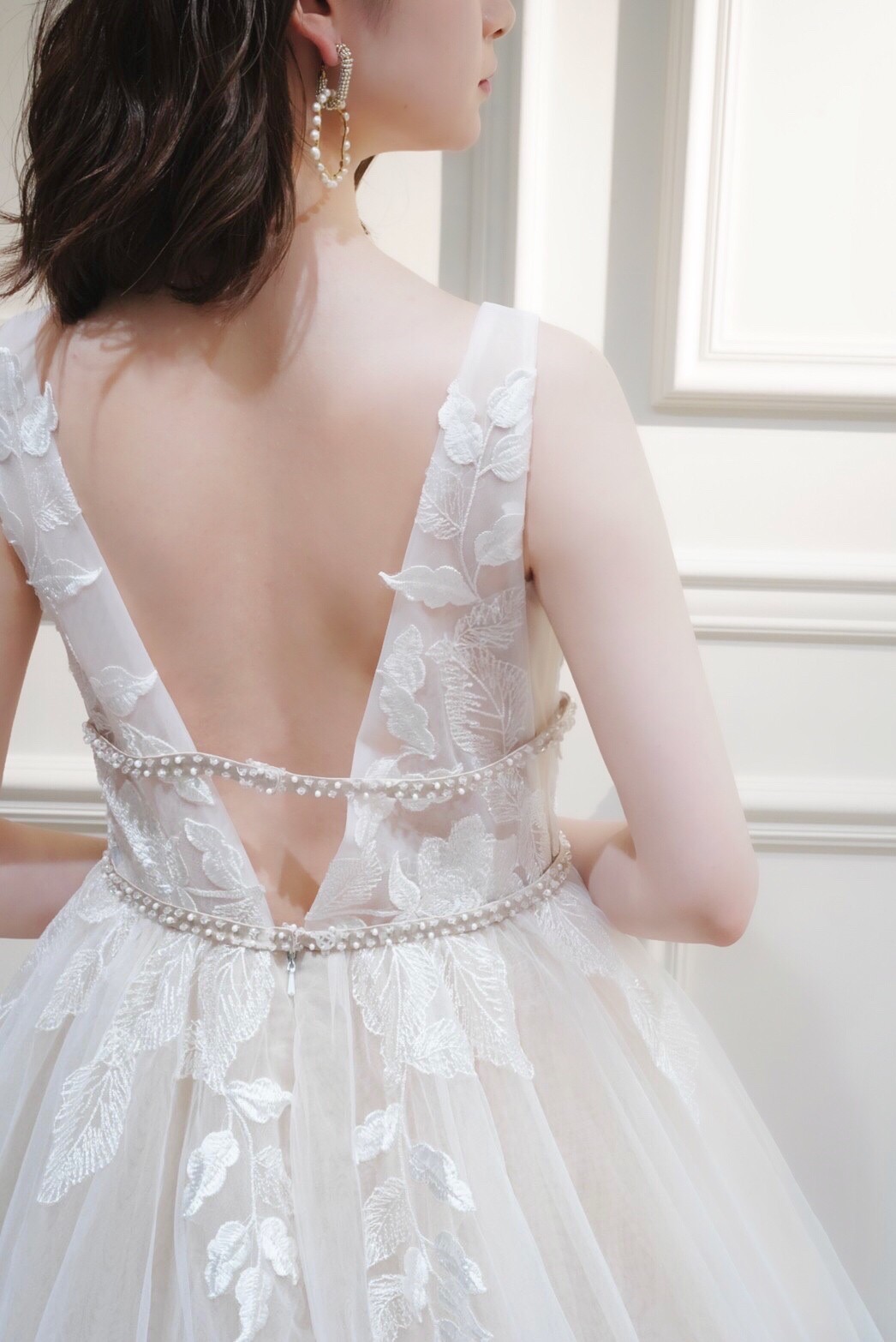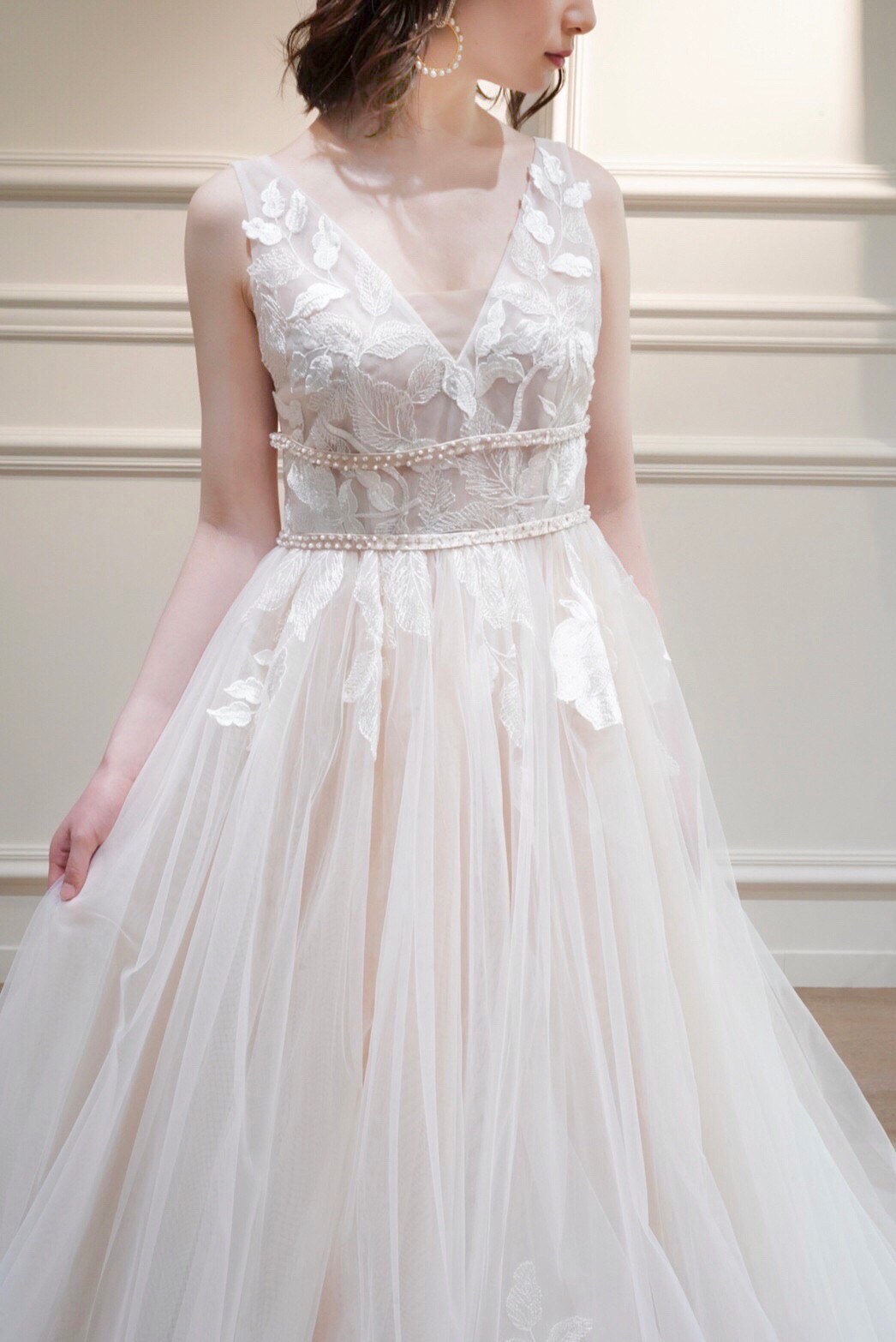 フラワーモチーフの刺繍がポイントの透明感あふれるチュールドレス。ピンクベージュの色味が可愛らしさを引き立たせてくれます。