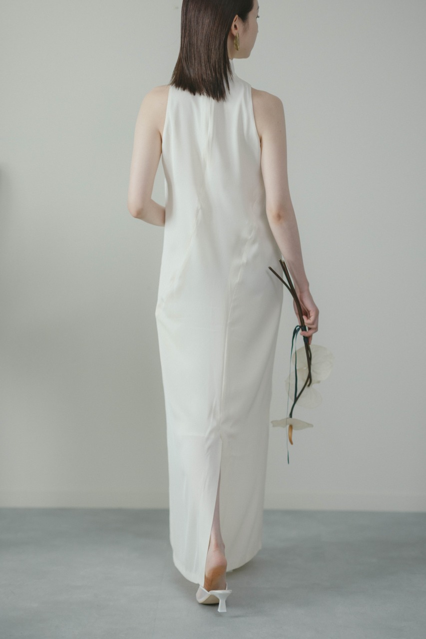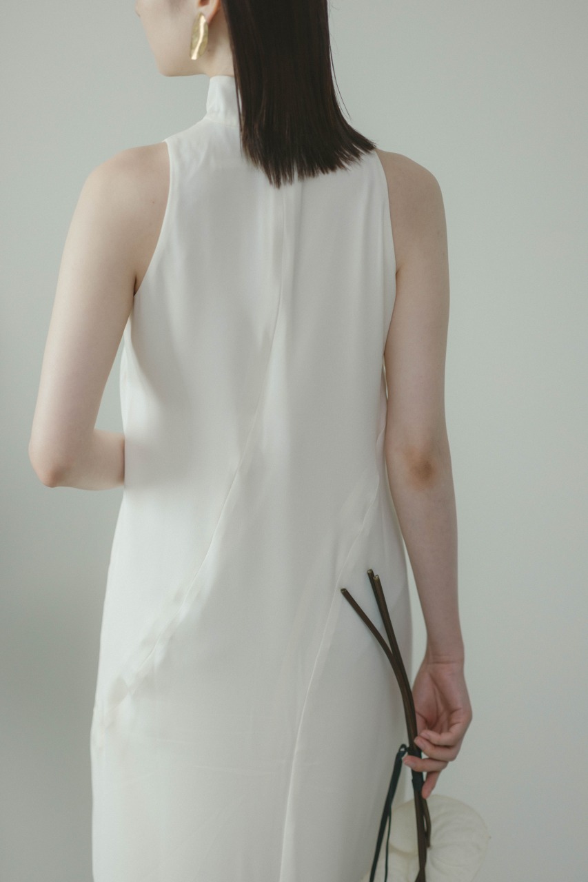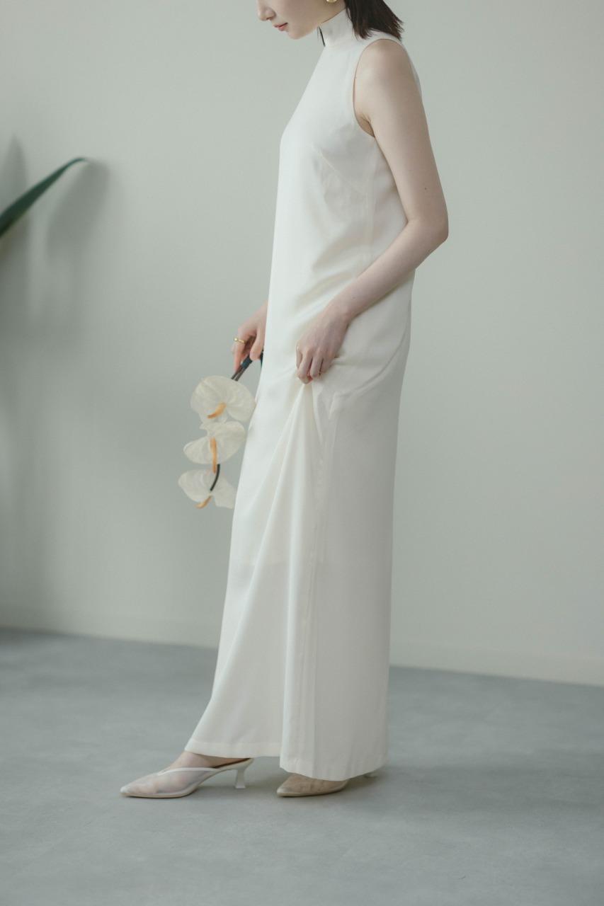 - 首元は詰まったハイネックデザインで、上品さと落ち着きを感じさせる一着。 シンプルなIラインのシルエットは、すっきりとした印象を与えながらもどこかリラックス感があり、普段着の延長のように自然にまとえるドレスです。さりげないおしゃれを楽しみたい方におすすめです。